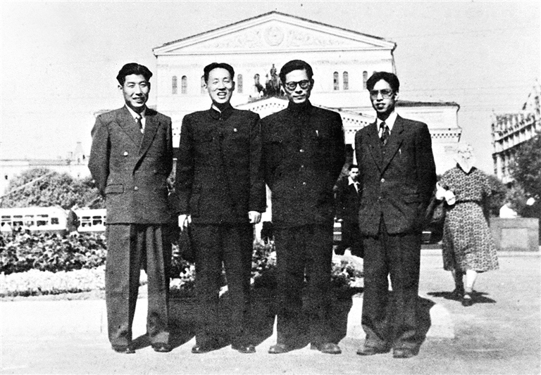 1955年至1956年,江泽民同志(右二)曾在莫斯科斯大林汽车制造厂实习。这是江泽民等在莫斯科合影。新华社发