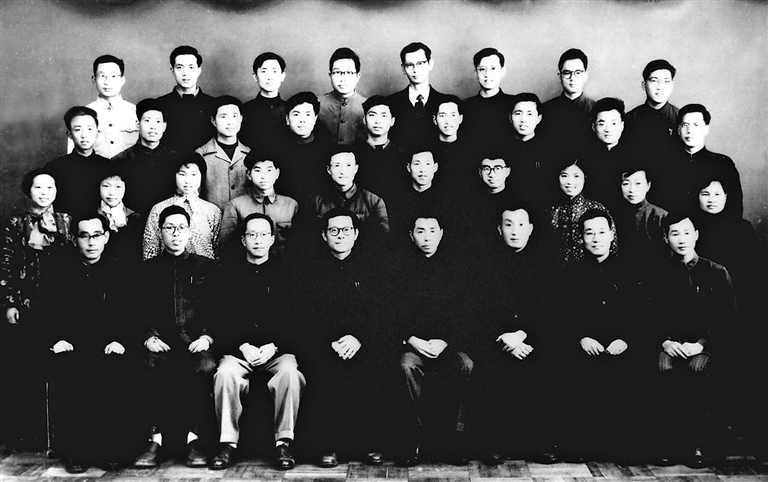 1963年3月,江泽民同志(前排右五)在上海同小型三相异步电机全国统一系列设计领导小组成员合影。 新华社发