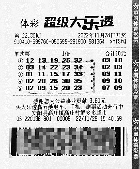 据了解,赵先生来自安阳,已有十几年的购彩经历,大乐透是他最喜欢的玩法,只要有时间就会去打几注,花费基本上在十元、二十元左右。谈及大家关心的“中奖秘笈”,赵先生连连摆手说:“这张彩票是机选的,虽然有时候自己也选选号来守号,但谈不上什么购彩技巧。”