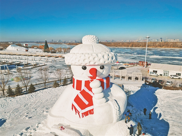 近日,哈尔滨市道里区群力松花江畔,一座高18米,用雪量2000立方米的“大雪人”正在搭建中,吸引了不少市民前来。生活报记者 王伟健 摄