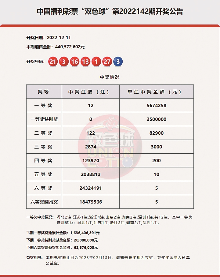 11日晚,中国福利彩票双色球游戏第2022142期开奖。本期双色球红球号码为1、3、13、16、21、27,蓝球号码为3。