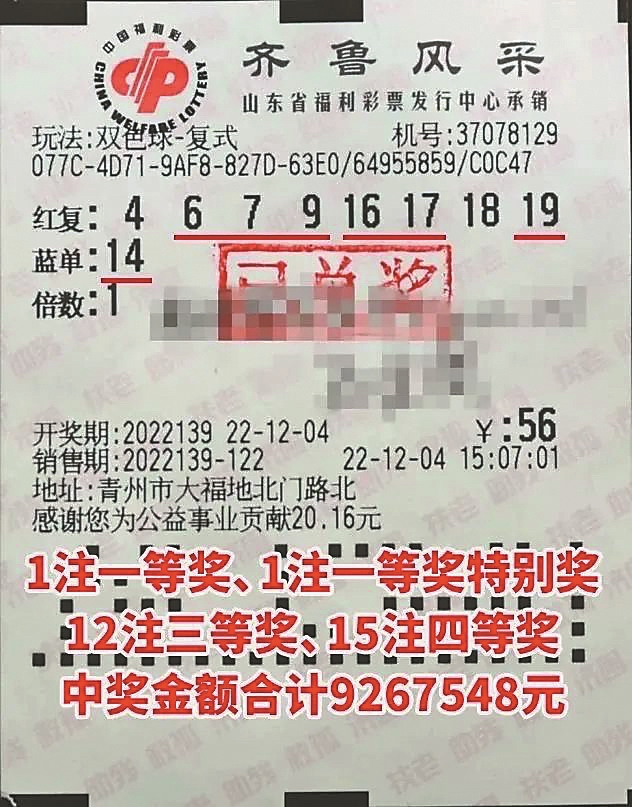 4日晚,福彩双色球第2022139期开奖,全国共计中出双色球一等奖12注,单注奖金700万余元。且9注为一等奖特别奖,其中1注花落山东潍坊,中奖彩票为一张56元复式彩票,票面总奖金为926万余元(含派奖)。