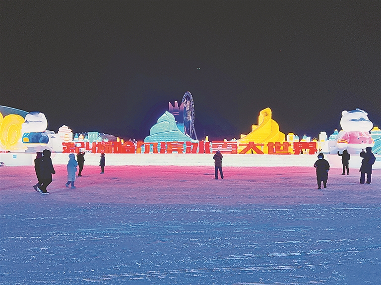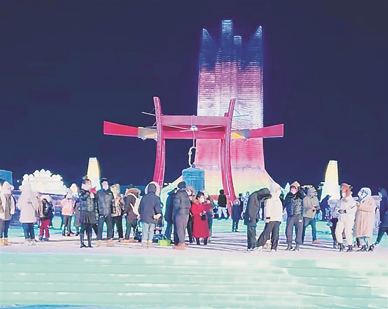 当晚,随着夜幕降临,游客们纷纷来到景区,在一个个流光溢彩的冰雪建筑前打卡。他们有的驻足在精美的冰雪建筑前,举着手机连连拍照;有的乘坐“小火车”环游整个景区;有的直奔今年的特色项目雪花摩天轮、超级大滑梯等。