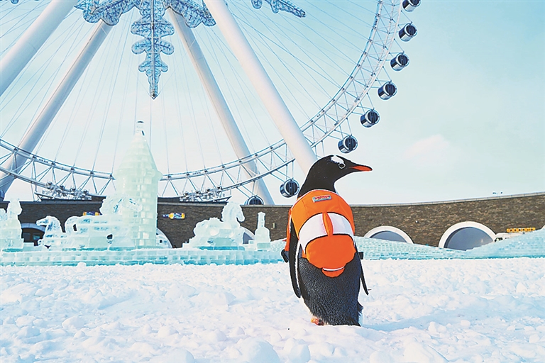 此外,夜幕降临前,哈尔滨极地公园的1只“淘学企鹅”和5只白眉企鹅也来到哈尔滨冰雪大世界“助阵”,在主塔和雪花摩天轮等处与游客们互动。