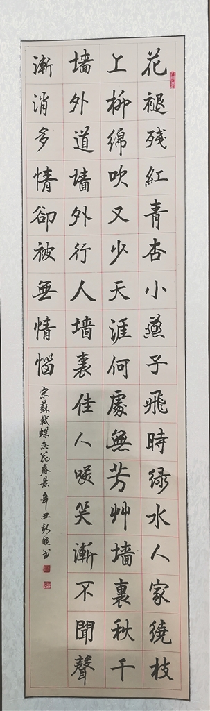 这是我写的一幅书法作品,出自宋代苏轼的《蝶恋花·春景》。这首词将伤春之情表达得既深情缠绵又空灵蕴藉,情景交融,哀婉动人。