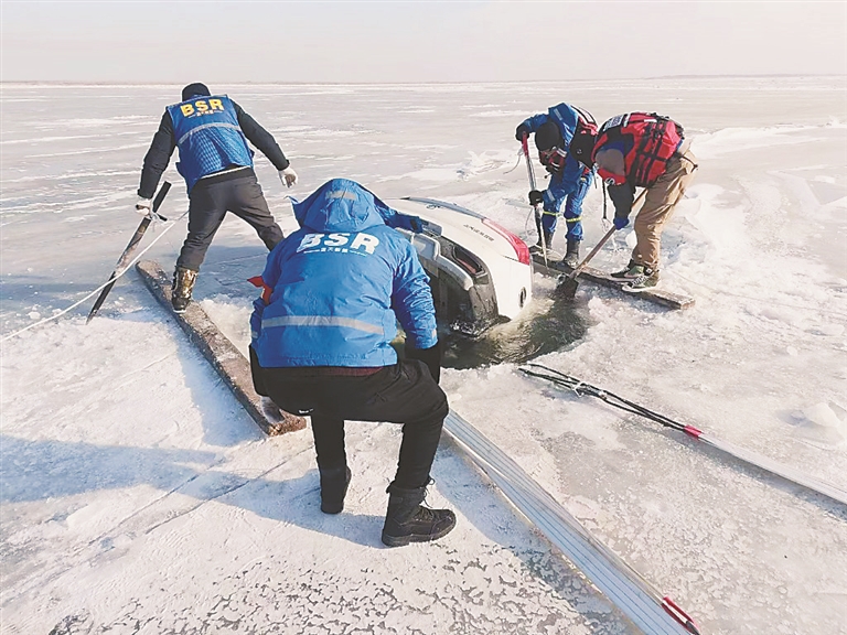 救援人员立即在车身周围铺设长条木板,固定好落水车辆,防止出现意外下沉,采用冰镩子和油锯等工具,对车辆周围坚硬的冰层进行破拆。江岸上四辆带有绞盘的大马力越野车,通过拖拽绳索拉住落水车辆车身。