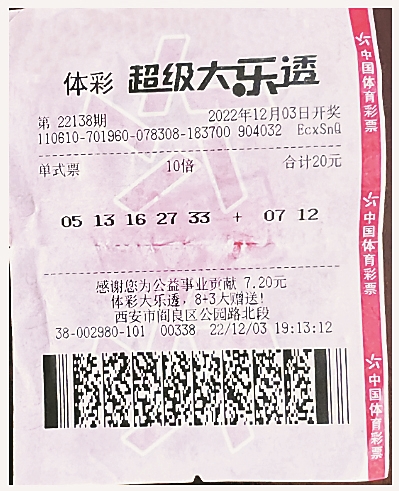 生活报讯 (雪尘) 3日,体彩超级大乐透第22138期前区开出号码“05 13 16 27 33”,后区开出号码“07 12”。西安一家体彩店包揽10注一等奖,中奖彩票单票擒奖7323万元。9日,幸运的中奖者李先生(化姓)来到体彩中心兑取了奖金。