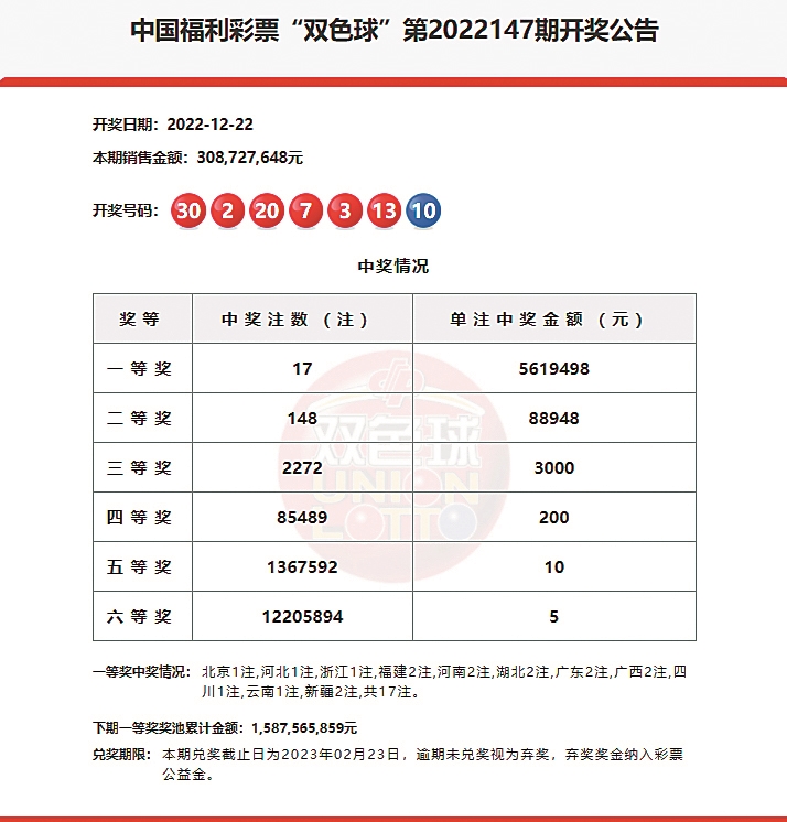 22日晚,中国福利彩票双色球游戏第2022147期开奖,本期双色球红球号码为“2 3 7 13 20 30”,蓝球号码为“10”。