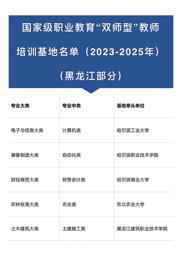 生活报讯 (记者吕晓艳) 记者从省教育厅获悉,在国家级职业教育“双师型”教师培训基地(2023—2025年)中,黑龙江5个基地入选。