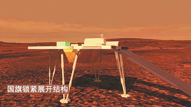 在着陆火星前,国旗形状记忆锁紧释放结构通过形状记忆聚合物复合材料片层的弯曲变形,使国旗(旗面由兰州空间技术物理研究所研制)长时间保持卷绕收纳的锁定状态;着陆火星后,通过形状记忆聚合物复合材料片层的回复,实现国旗的超低冲击解锁和可控展开。团队对形状记忆聚合物复合材料进行了地面模拟火星低温存储实验、紫外线、伽马射线辐照实验,综合评估了材料的力学和形状记忆性能,验证了材料具有良好的火星环境适应性。团队在地面多次成功完成了模拟火星环境下的国旗解锁与可控展开,证实了该结构具有高可靠性。与展开瞬态冲击高达10000g以上的火工品相比,该国旗锁紧释放结构几乎无冲击,同时该结构具有质量轻、收纳比高的优点,适用于较大尺寸国旗的收拢与展开。