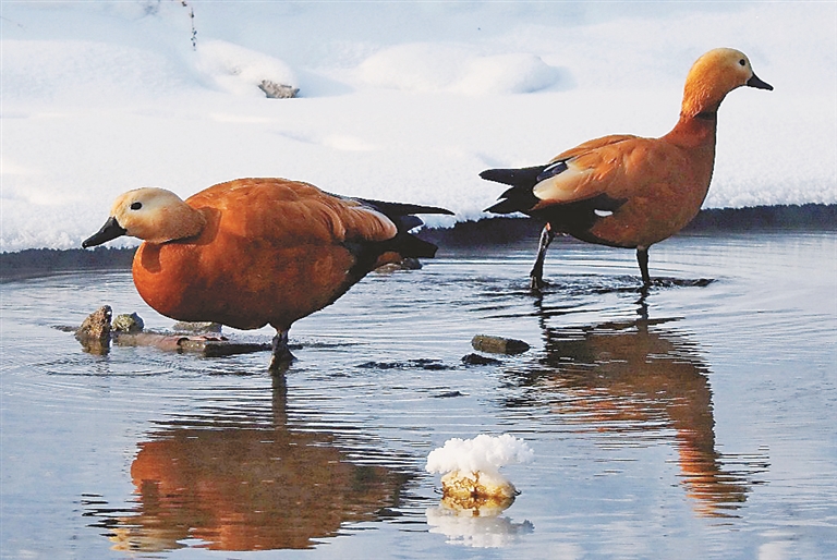 岸边雾凇美 桥下水鸟欢