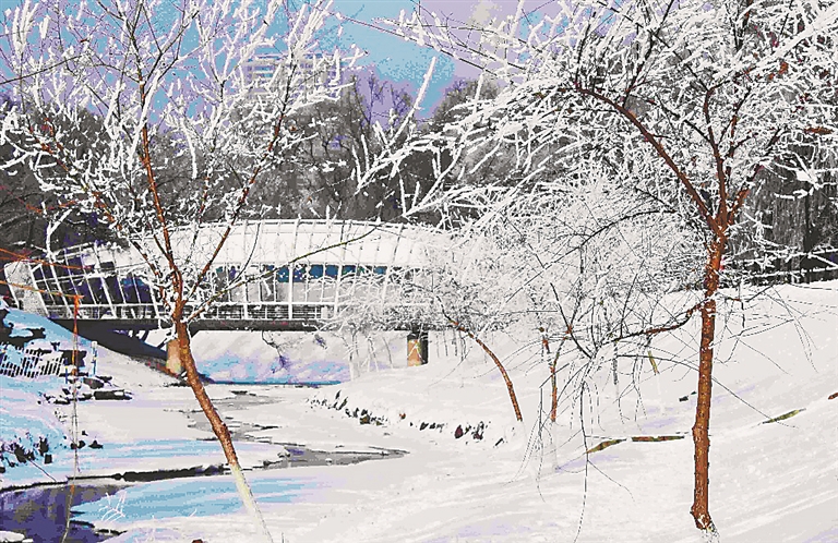 28日中午,生活报记者来到现场,封冻的马家沟河在这里出现开河现象,水流带有一定温度,水蒸气将两岸树木进行了一番“美颜”。记者在一片银装素裹中看到,桥下河床上有2只颜色艳丽的大鸟,一会儿在水中觅食,一会儿在雪地上穿行,不时吸引岸上的行人驻足拍照。