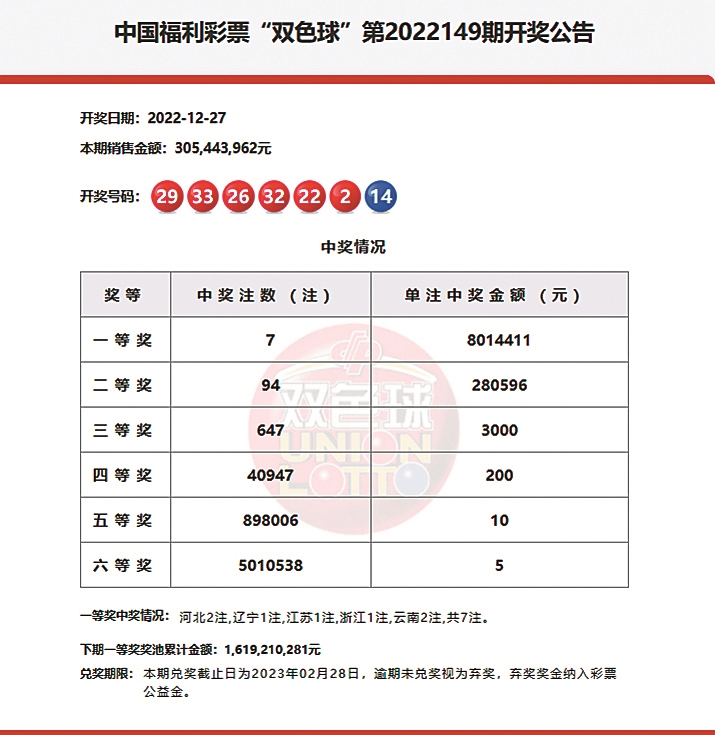 12月27日晚,中国福利彩票双色球游戏第2022149期开奖。本期双色球红球号码为2、22、26、29、32、33,蓝球号码为14。