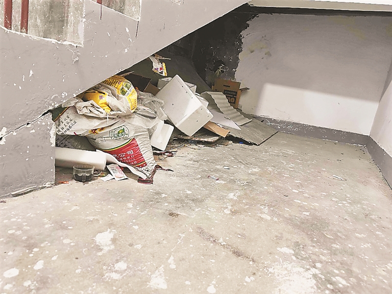 29日,记者在现场看到,一楼楼梯空隙中堆放很多杂物,有泡沫箱和纸壳盒,还有木板等。