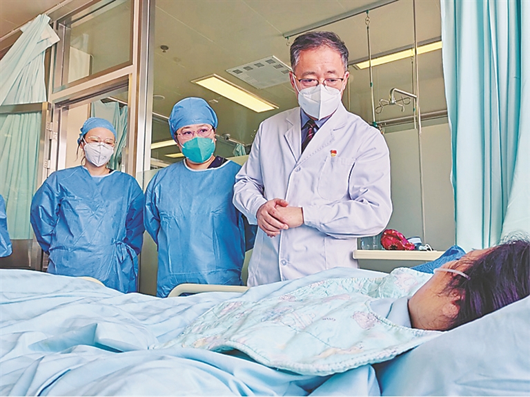 于波教授、候静波教授和刘芳副主任医师查看刘女士情况