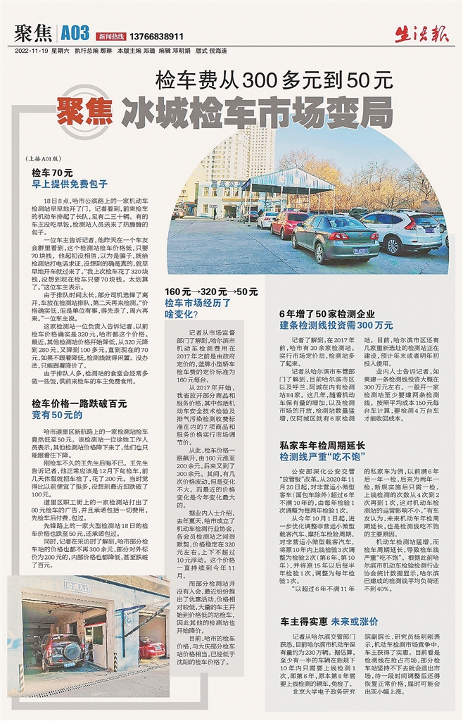 “因为检测能力饱和,外地出现9.9元检车的低价格,这会引发系列问题。极有可能让打价格战的乱象重蹈覆辙。同业间的恶性竞争,将导致检车站降低检测标准,致使大量‘带病车辆’回归市场,存在严重交通安全隐患。”孟凡松提出,管理部门应关注哈市机动检测站经营现状,建议机动车安全技术行业可探索实施企业投资项目管理“负面清单”制度,通过检测能力公示等方式对该行业提出产能严重过剩预警,提醒投资者慎重决策、理性投资。此外,建议政府暂缓审批发放检车站开办资质,出台检车站准入门槛机制,严禁无房产证土地使用证和私建滥建的违规审批。