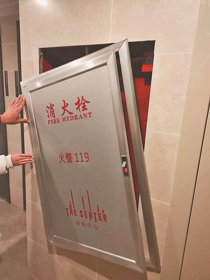 随后记者同张先生下楼,来到小区一栋高层,在途中看到,部分路段的步道板已经有破损,部分墙面的墙皮有脱落、掉皮的现象。高层楼下单元门门牌,也是用胶带粘上的。高层住宅内,记者确认了一楼的消火栓内,设施齐全。随后,记者乘坐电梯来到顶层,顶层的消火栓内则是空的。记者看到,在顶层的消火栓旁边,有一个水压表,水压表的指针显示,目前管线内水压是零。记者向下走了一层楼,随机查看住户门前的消火栓,只是用手轻轻地碰了一下消火栓的门,消火栓的门就掉了下来,幸亏张先生及时扶住,不然就安不回去了,消火栓里面也是空的。