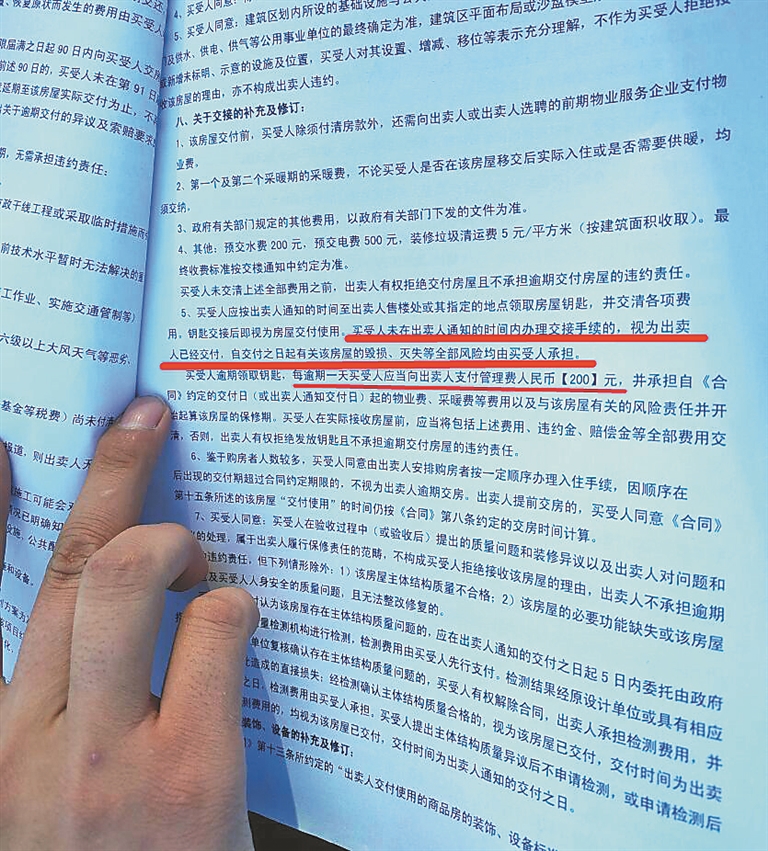 记者看到,在《商品房买卖合同补充协议》中,有一条写明:自交付之日起有关该房屋的毁损、灭失等全部风险均由买受人承担。张先生告诉记者,现在小区的消防设施不齐,还听说协议中有这一条后,就不想办进户了,但开发公司却称,不管进不进户,物业费都是从1月10日开始收取,即使不进户,不领钥匙,每逾期一天也得交200块保管钥匙的钱。
