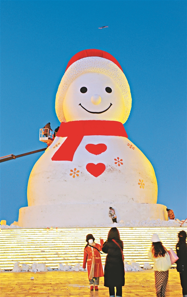 经过十余天精心雕琢,4日,位于哈尔滨市友谊西路音乐长廊内的网红大雪人雪雕景观主体完工。在完成一些细节打磨后,预计5日傍晚大雪人将以崭新的姿态与市民游客见面。这个头戴红色绒帽,围着大红围巾,穿着雪花外套,系着心形纽扣的雪人嘴角上翘、面含微笑,看起来喜气洋洋。该雪人高18米、总长13米、宽10米,用雪量约2000立方米。4日晚,已有外地游客络绎不绝前来与大雪人合影。龙头新闻记者 张澍 摄