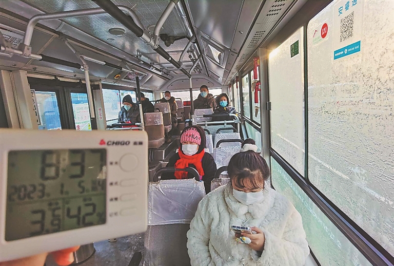 生活报讯 (记者肖劲彪文/摄) 近日,本报持续报道的哈市部分公交车车厢温度低的问题,备受市民关注。根据读者反映,5日上午,记者乘坐379路公交车,发现该车并未开启暖风,实测该车温度为3.9℃。