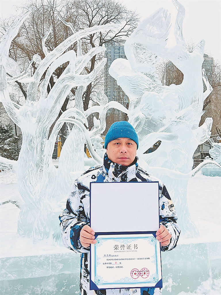 8日,在兆麟公园刚刚落幕的42届全国专业冰雕比赛中,孙卫林参与主创雕刻的冰雕作品《森林之歌》获得本次大赛金奖。其中,这组冰雕里老鹰的翅膀和弓箭的细节部分,都由孙卫林完成。这已是他从事冰雕行业多年来第三个金奖。
