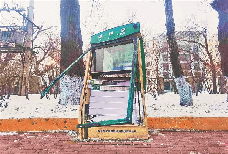 生活报讯 (记者肖劲彪 文/摄)8日,市民徐先生反映称,哈市南岗区科研路福利院站公交站牌破损严重,不仅影响城市的形象,还阻碍行人通行,希望相关单位尽快修复。