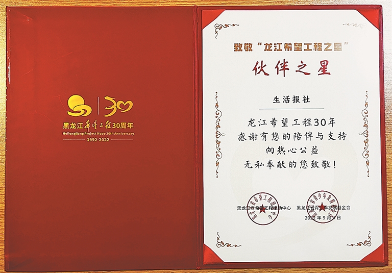生活报讯 (记者李丹) 1992年9月,作为全国成立最早的省级青少年发展基金会,黑龙江省青少年发展基金会开始实施希望工程,截止到2022年已走过30年。30年来,龙江希望工程涌现出一批彰显大爱、乐于奉献的集体和个人,黑龙江省希望工程捐助中心、黑龙江省青少年发展基金会开展致敬“龙江希望工程之星"活动,回望令我们动容的执着与坚守,感恩直指人心的奉献精神。活动中,生活报荣获“公益伙伴之星”荣誉称号,助力“希望工程”,30年来生活报一直在路上。