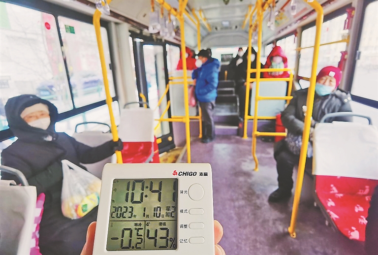 10日10时25分,记者在道外区阿拉伯广场公交站乘坐一辆70路公交车,此时公交车的玻璃上都是霜,车内感觉到明显的冷意。记者随身携带测温计,车厢内显示最低气温为-0.2℃。