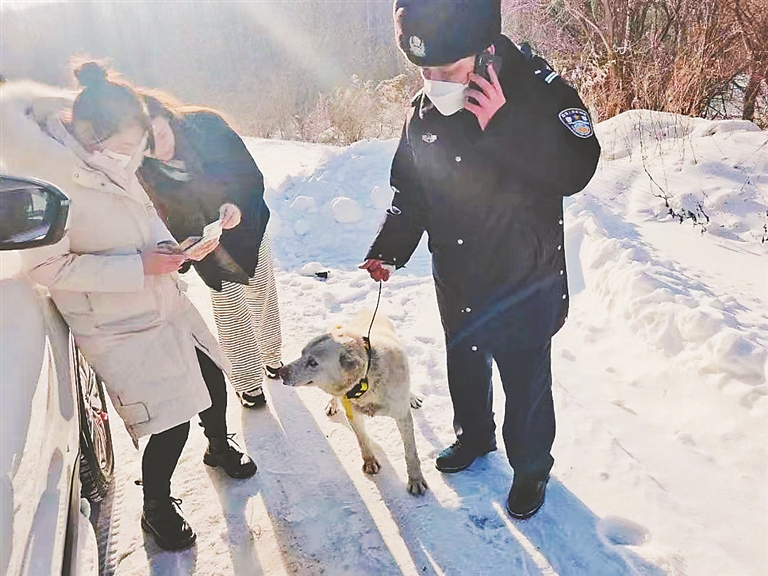 救援结束后,这只哈士奇恰好从树林中走出来蹲坐在民警身边。经进一步辨认,确系其是附近林蛙养殖户饲养的的宠物,民警电话通知养殖户将宠物领回并加强管理。