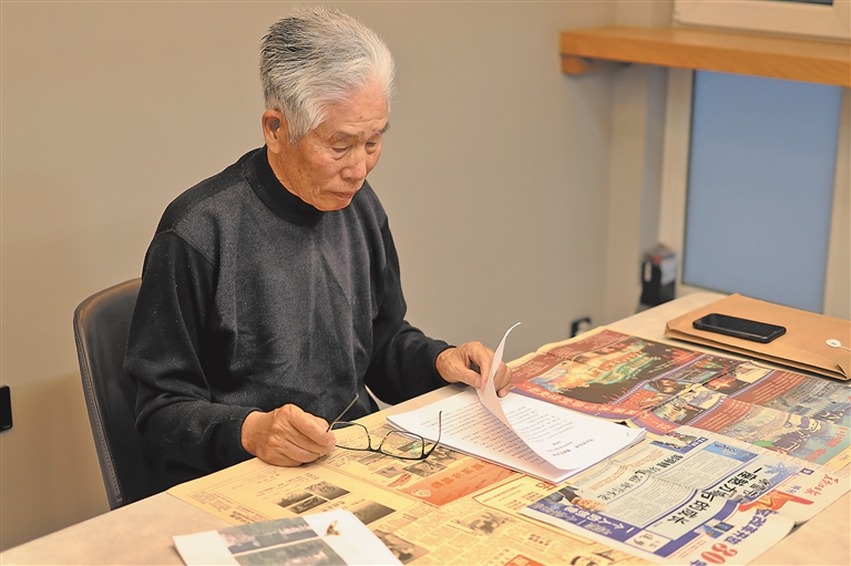 88岁的邹得鲤老人翻看着文字资料寻找着自己的冰雪节记忆