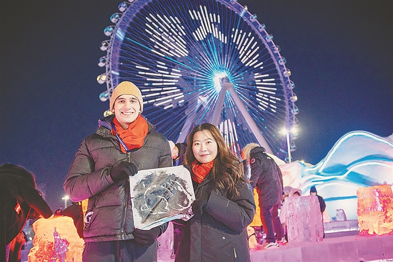 上午活动中,来自黑龙江大学各国留学生代表与中国青少年结对在雪博会互动,互赠新春礼物,中外青少年小手拉大手,共游太阳岛雪博会,留学生们品味了东北特色美食“铁锅炖”等美食感受中华美食的魅力。下午,活动一行人在哈师大文博馆,领略中国传统文化。傍晚,中外青少年在流光溢彩、美轮美奂的哈尔滨冰雪大世界中感知冰雪艺术的魅力。在冰雪艺术体验营聆听冰雕制作过程,学习将冰与中国传统木刻版画相结合,亲手设计制作属于自己独一无二的冰版画,体验冰雪带来的乐趣。
