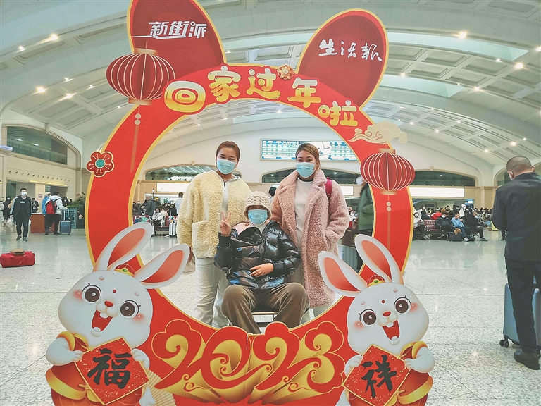 “拍张照片吧,这个留影板很漂亮。”在候车大厅,两个女孩推着一位坐轮椅的老人,开心地留下合影。交谈中记者了解到,29岁的女孩小君家住鸡西市,她和妹妹一直在外地打工,4天前她们回到家乡,趁着过年假期带着母亲来哈市复查脑瘤。“妈妈的脑瘤已经长了将近20年了,这次复查一切正常,真的很开心。”