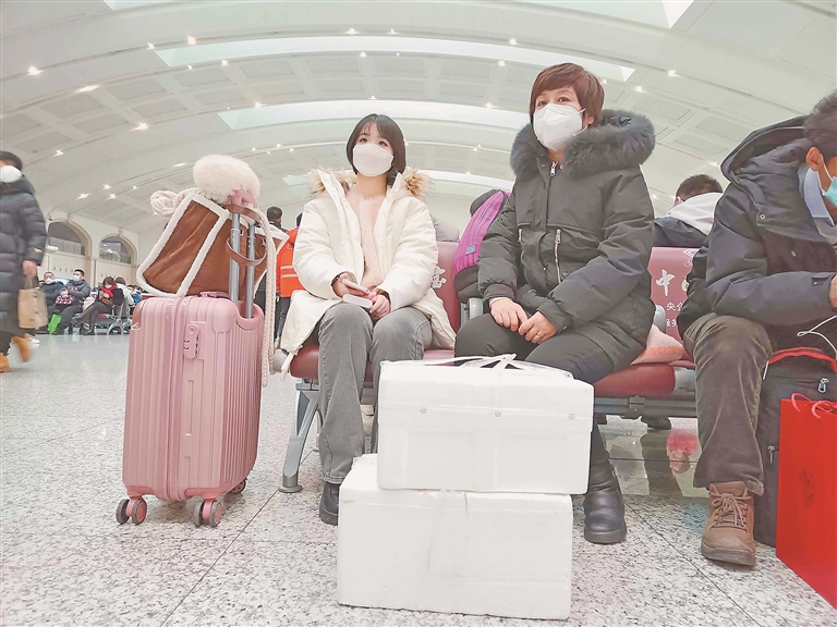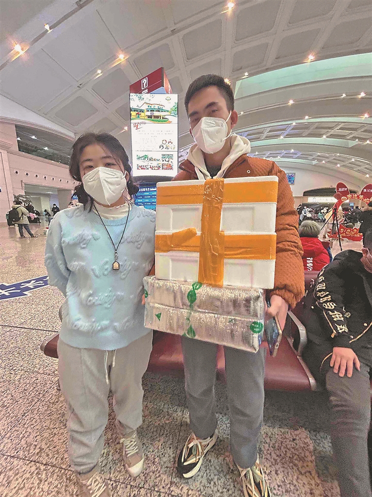 “老爸,把锅刷好了等我啊,我给你拎活鱼回来了。”……在哈站候车大厅,人们给家人报平安和汇报“新年礼物”的声音此起彼伏,他们把对亲人的牵挂和爱寄托在自己精心挑选的礼物上。