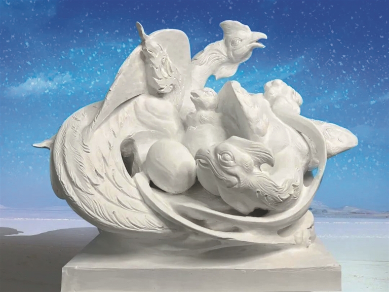 作品是一对孕育小鸡的鸡夫妇,象征着勤劳和可爱的家庭。小鸡代表对未来有创造力的年轻人,他们被保护,被照顾,被给予机会,成长之后,自信地飞向世界。