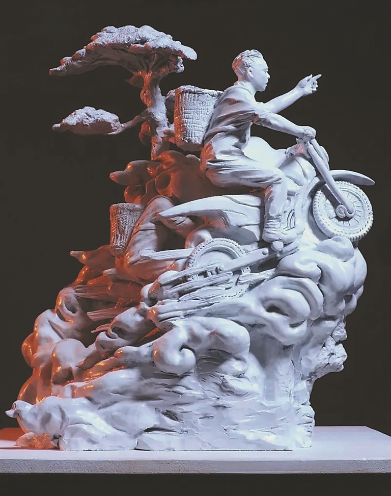 以2022年重庆山火救火摩托车青年为创作灵感,表达中国青年志愿者的勇敢、担当与激情。以雪雕烟,以冰铸火,冲破烟云的骑士手指前方;高耸的松树,寓意顽强的生命力和不屈的英雄气概。