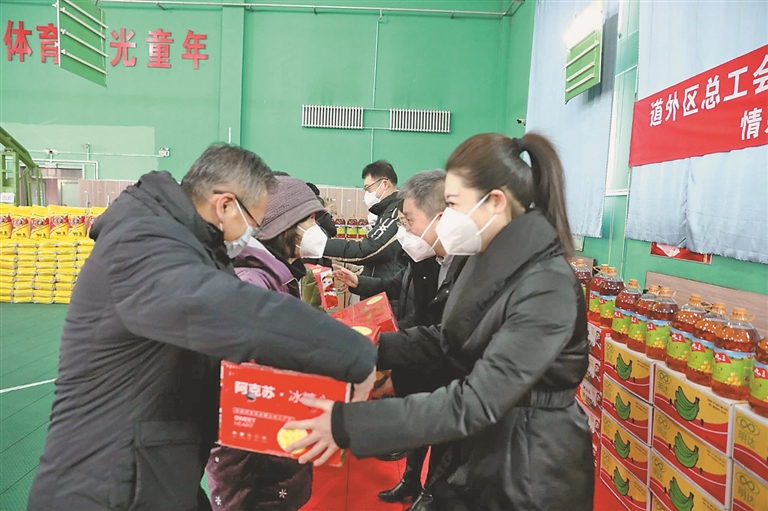 近日,“情系一线职工 工会关爱相伴”2023年道外区总工会春节送温暖活动启动仪式在大同小学校体育馆举行。活动现场,工作人员为26个镇(街)的居民发放慰问资金及大米、豆油、水果等慰问品。