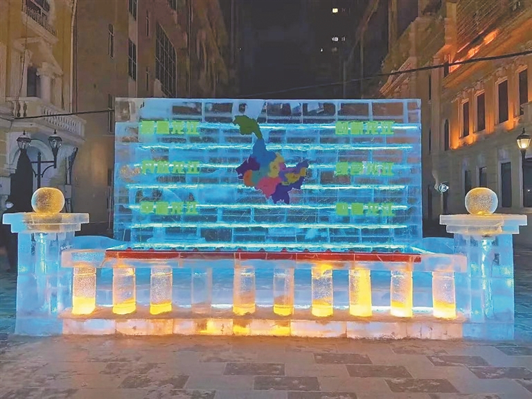 中央大街倾情打造的以“六个龙江”为主题的冰雕,13个按钮对应省内13个地区,按下每一个按钮对应的城市将会被点亮。当13个按钮同时被按住,这13个地区的地图组合而成的黑龙江地图就会被一起点亮。