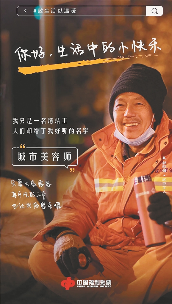 北京市昌平区北清街道的环卫工人郭师傅,每天凌晨4点出工,忙到下午5点。凌晨休息的片刻,他坐在马路边,取出福彩暖冬保温杯,喝了几口热水,脸上洋溢着幸福的笑容,生活虽然不轻松,但他脚踏实地,对未来充满盼头。