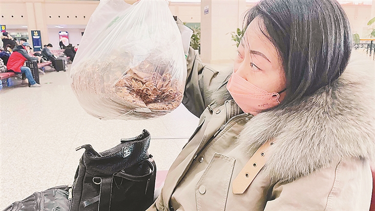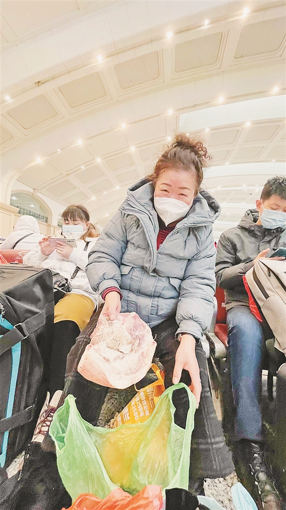 “这家伙,装了一袋子笨猪肉,还有一口袋饺子,一会儿化了可咋办啊?”在哈站二楼候车大厅,从哈尔滨去往吉林的赵阿姨不停地倒腾她带的“年货”。