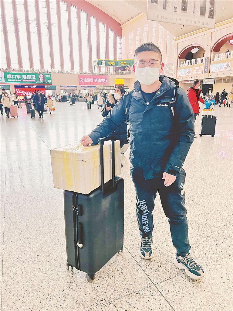 28岁的小张告诉记者,他的老家在绥化,在北京工作两年没有回家,今天返程,父亲特意开车送的他。小张说:“这个年过得特别有意义,因为能与家人团聚,临走时父母还给他装了一箱冻货,有大虾、猪肉、红肠。”