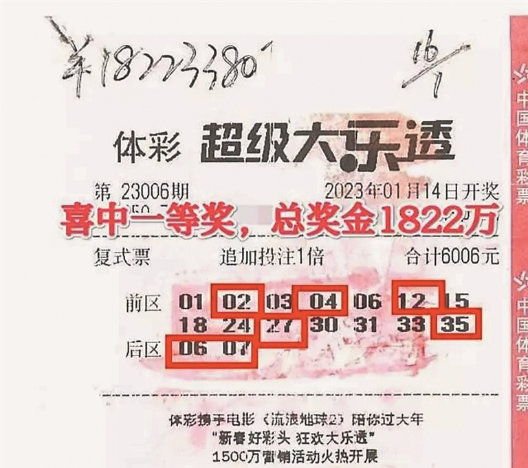 票面显示这是一张14+2、6006元投入的复式票,投注时间为1月14日上午11点04分。该票除了命中1注一等奖外,还中得45注四等奖、360注六等奖、840注八等奖、756注九等奖,并且在追加投注的加持下多得800万元的追加奖金,单票总奖金高达1822万元。