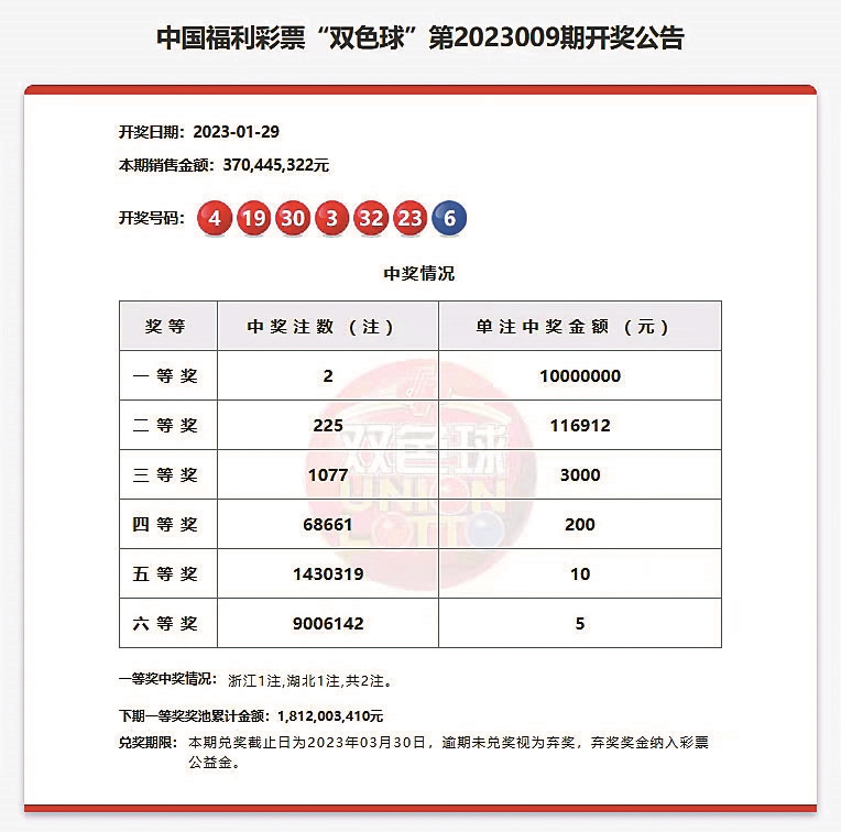 29日晚,中国福利彩票双色球游戏第2023009期开奖。本期双色球红球号码为3、4、19、23、30、32,蓝球号码为6。