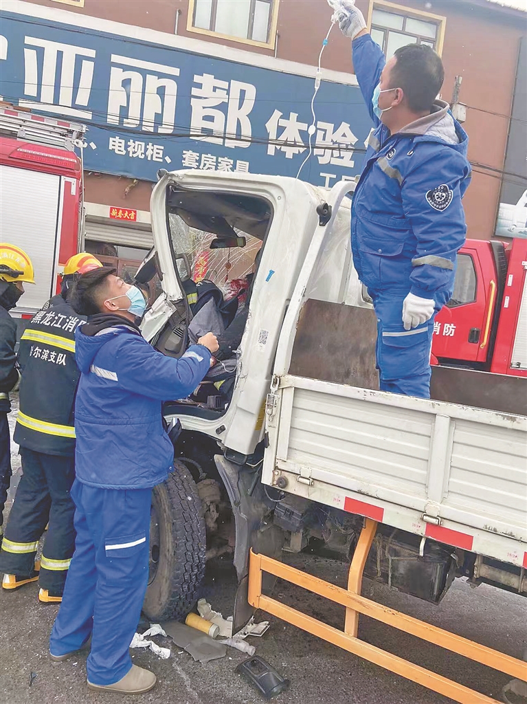 生活报讯 (记者周琳) 1日上午,哈市天恒大街上两辆货车相撞,一男子被卡在车内。为给男子赢得治疗时间,120急救人员在消防人员破拆的同时,为男子建立静脉通道、补液。1日,生活报记者联系到哈市120急救中心红十字中心医院分中心李雪丽医生,对此事进行了采访。