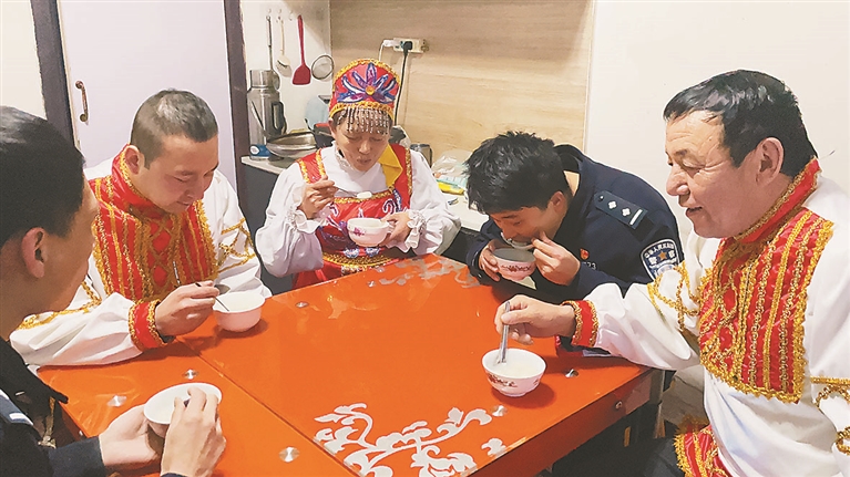民警和村民们围坐在一起,有说有笑地包汤圆,揉面的揉面、拌馅的拌馅,一派热闹景象。搓、捏、按、团,一块块白白的糯米面团包上馅就成了诱人的汤圆,没一会儿,香喷喷的汤圆就出锅了,大家围坐在一起吃着香甜软糯的汤圆。
