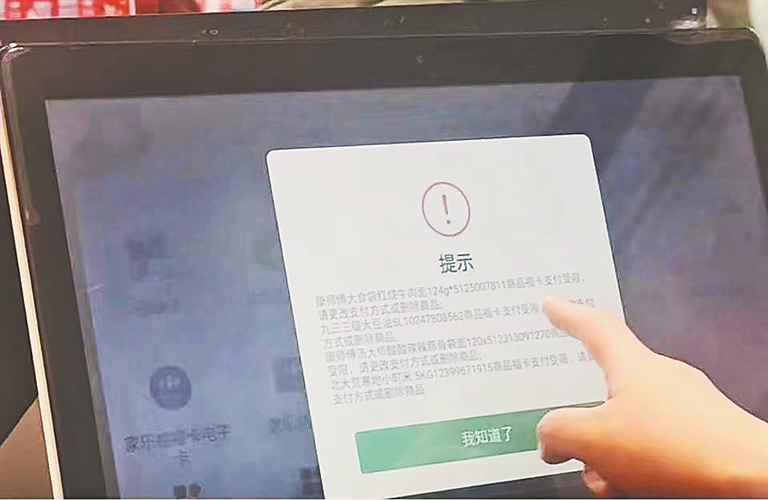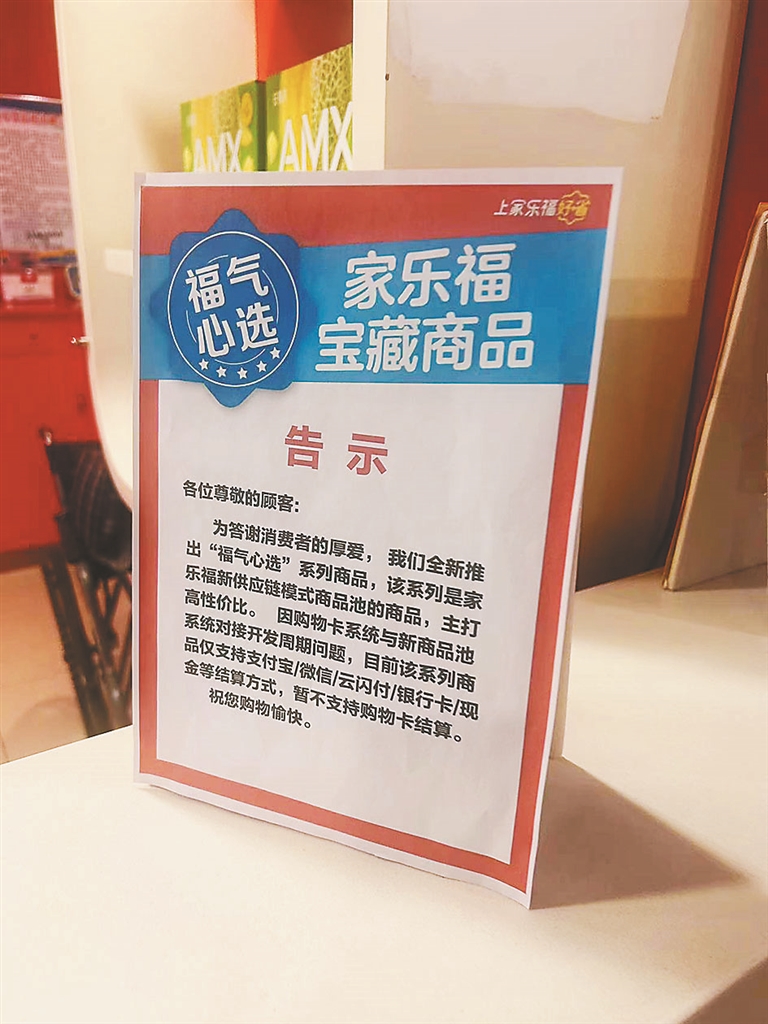 李先生和记者逐一询问各种卡片的区别,工作人员表示:“蓝色不能用、粉色标明‘可用福卡’的商品能用,还有就是没贴卡片的商品也能用,但最后还得去款台看能不能刷上。” 对于不能使用购物卡结算的原因,该工作人员表示:“供应商系统切换升级导致。”