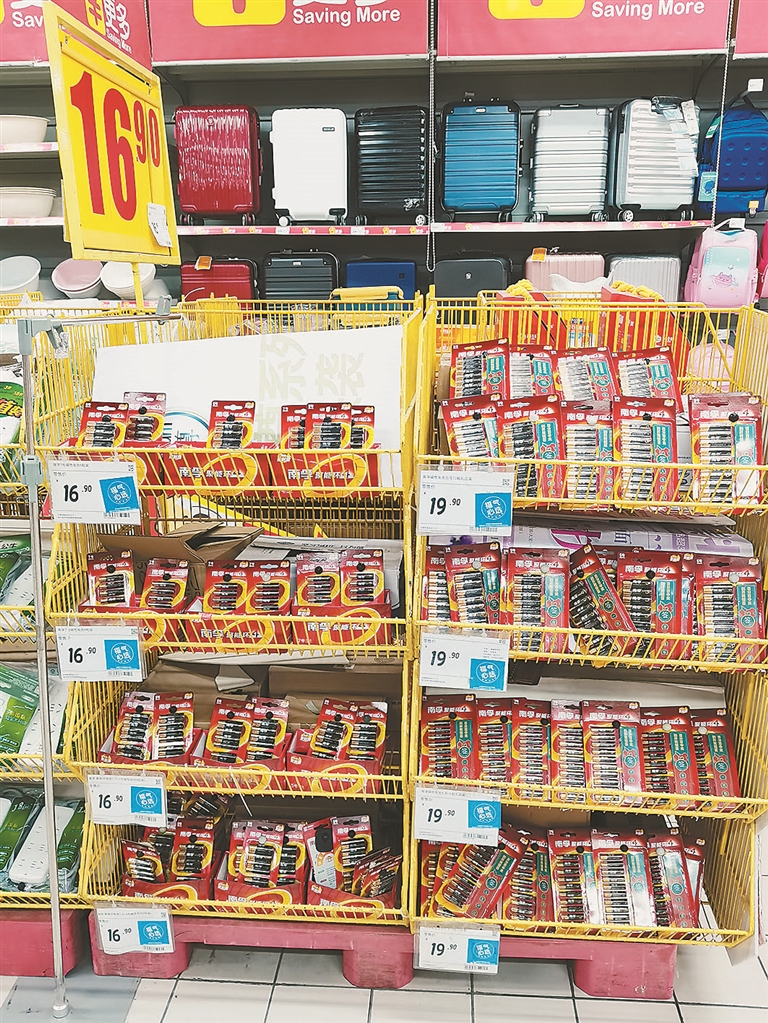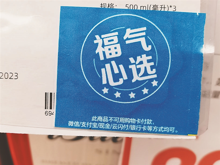 7日,记者陪同李先生来到家乐福大直街店看到,很多商品的价签上贴着蓝色、黄色、粉色的卡片,也有的价签上没有卡片。米、面、食用油、饮料、卫生纸、方便面、酒类、洗衣液、电池等商品都贴有写着“福气心选”的蓝色卡片,卡片下方2行小字显示:“此商品不可用购物卡付款,微信/支付宝/现金/云闪付/银行卡等方式均可。”在标着5折、8折的特价区,摆放着酒水、饮料、糖果、饼干、罐头、小食等商品,工作人员告诉记者:“此类商品也不能用储值卡结算。”
