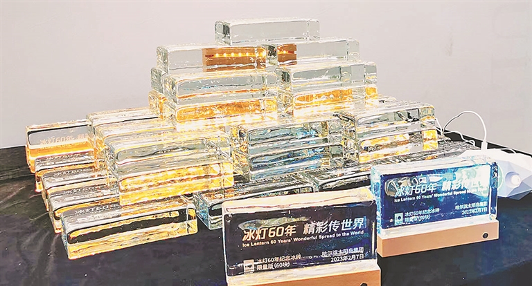 在兆麟公园八角亭“哈尔滨冰灯60年历史文化展”展厅内,哈尔滨冰雪文化艺术见证者,原哈市冰灯游园会办公室副主任、冰雕技艺非遗传承人张永滨和黑龙江省美术家协会冰雪艺术委员会主任朱晓东,共同为象征冰灯60年的文创“冰砖墙”堆砌而成的“冰砖金字塔”揭牌。