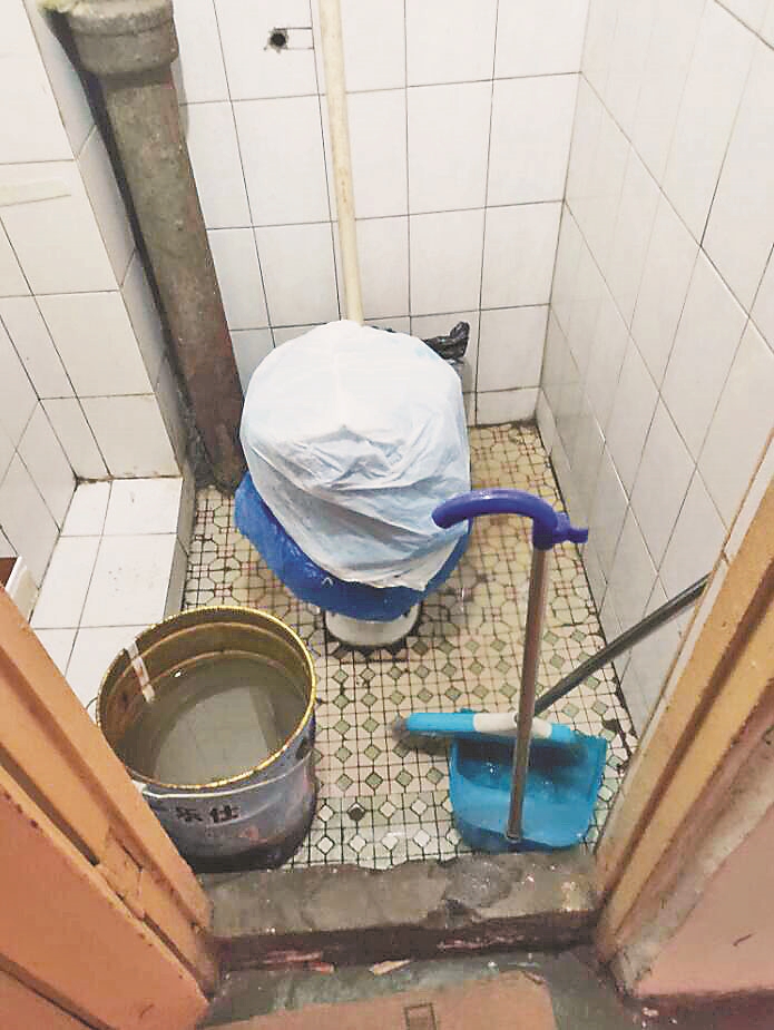 永和街70号203室的住户王先生说:“我过年出门了,初五回来的时候,就发现返水了。当时就找物业了,来修了几回也没给修好,现在屋里还在不停返水。”7日,记者来到王先生家中,刚一进屋就能闻到一股臭味。屋里地面上铺着很多纸壳,用来吸地上的水和潮气。厨房的下水口用塑料布堵死,为了不返水,王先生在下水口上压了一个煤气罐。卫生间里地面上还有一层混浊的臭水,虽然马桶已经用塑料布堵住,臭水还是不停地从马桶下方返出来。王先生告诉记者,现在每隔几十分钟,就得淘一次水。“只要楼上一用水,我家就肯定返。从我初五回来到现在已经快半个月了,一直是这种状态。”