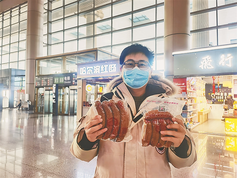 随后,记者来到哈尔滨西站看到,哈西站内有多个商亭销售各品牌红肠。秋林里道斯店员告诉记者:“春节前一周的销量和返程高峰一周的销量,比1月初增加了一倍,买红肠、儿童肠的人都很多。”