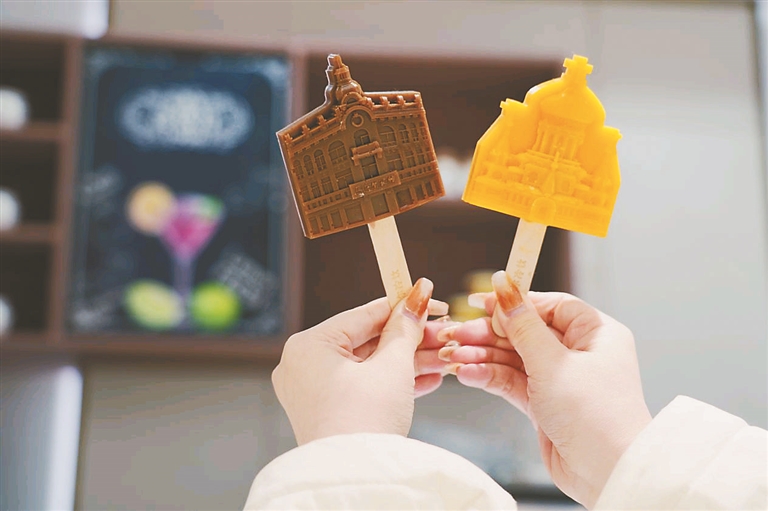 马迭尔冰棍柜台的后身就是马迭尔冷饮厅,这里销售的是升级版的十种“网红”文创冰棍,包含野生蓝莓、酒酿桂花、吕宋芒果、天鹅绒巧克力等口味,价格每根10元至18元不等,造型是微缩版的马迭尔宾馆、索菲亚教堂、防洪纪念塔等等,十分吸睛。记者注意到,不少游客纷纷拿着造型各异的文创冰棍拍照留念,其中软萌可爱的兔子造型冰棍最受女性游客喜爱。据游客们讲,文创冰棍已成今年春节新的打卡单品,手捧一支马迭尔宾馆、索菲亚教堂、雪花等造型的冰棍在哈尔滨拍照“打卡”,已成为新时尚。